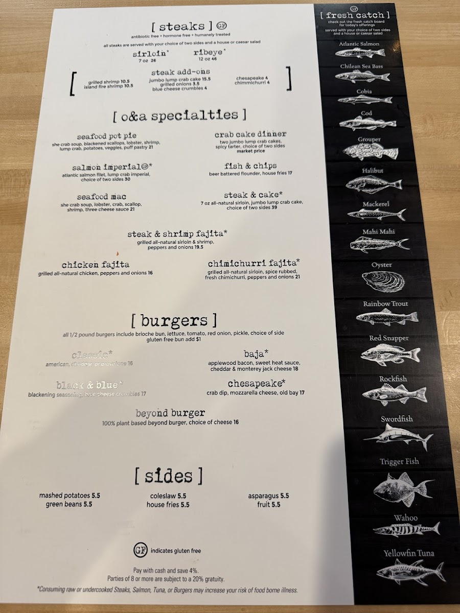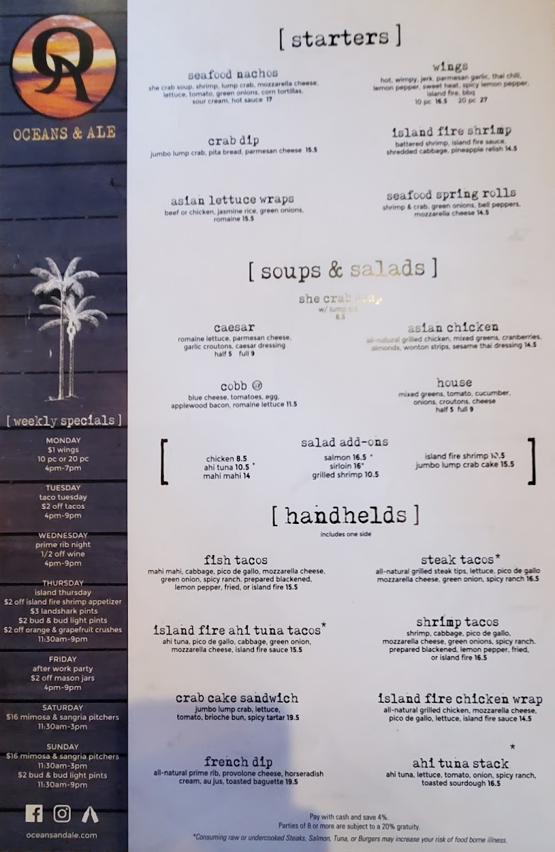 Introducing the menu at Oceans & Ale, located in the charming surroundings of Williamsburg, VA, this spot is a treasure for seafood lovers. With an upbeat atmosphere and a welcoming staff, it offers a delightful array of dishes that consistently impress diners. The menu features classic favorites such as expertly seasoned seafood, delightful burgers, and standout Caesar salads that rival those of fine dining establishments.